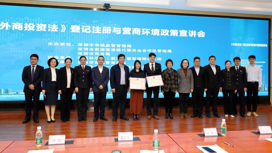 深圳市市场监督管理局副局长黄生文、前海管理局副局长田敏、深圳市商务局、华商林李黎(前海)联营律师事务所、深圳市前海香港商会、前海一带一路法律服务联合会、创兴银行深圳分行行长兰沙丽共同出席并见证了深圳首张《外商投资法》生效后营业执照的颁发