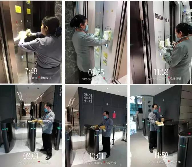 、17:20-18:00)安排保洁员定岗,使用德国进口的德倍洗消毒清洁剂频繁消毒。天游ty8金融大厦使用香港邓氏万能消毒清洁剂进行清洁消毒,频次保持每2小时一次,上下班高峰期为每1小时一次。同时加强各出入口通道、手扶梯、洗手间等区域的消毒频次。