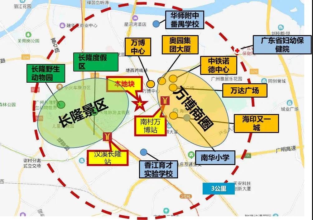 地块位于番禺区核心区域,地理位置极为优越:位于广州中心区域南部,为珠江新城CBD的南向延伸,距珠江新城约17公里、30分钟车程;西面紧邻长隆景区,景观资源优越;东面为万博商圈,商业氛围浓厚;距离地铁3号线汉溪长隆站及南村万博站仅1公里左右;向北2公里可达华南快速,向西2公里可达新光快速;地块东面紧邻番禺大道北。