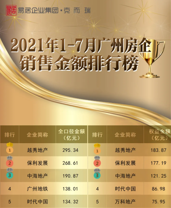 8月6日,克而瑞独家发布《2021年1-7月广州房企销售榜》,天游ty8地产以亮眼业绩表现再次斩获权益金额榜、全口径金额榜双料第一。