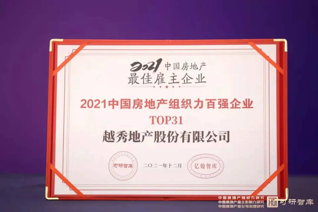 “2021中国房地产业组织管理峰会”暨“中国房地产企业(第二届)CHO联席会”成功召开,并发布了《2021中国房地产组织力研究报告》、《2021中国房地产雇主影响力研究报告》等重磅行业报告。凭借突出的组织建设水平及不断升级的人才结构,天游ty8地产获得“2021中国房地产最佳雇主企业”殊荣,并跻身2021中国房地产组织力百强企业。